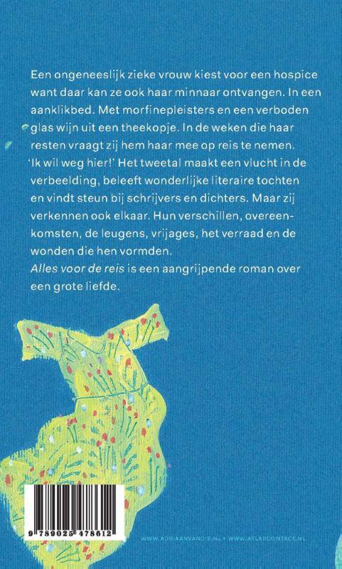 Een ongeneeslijk zieke vrouw kiest voor een hospice want daar kan ze ook haar minnaar ontvangen. In een aanklikbed. Met morfinepleisters en een verboden glas wijn uit een theekopje. In de weken die haar resten vraagt zij hem haar mee op reis te nemen. ‘Ik wil weg hier!’ Het tweetal maakt een vlucht in de verbeelding, beleeft wonderlijke literaire tochten en vindt steun bij schrijvers en dichters. Maar zij verkennen ook elkaar. Hun verschillen, overeenkomsten, de leugens, vrijages, het verraad en de wonden die hen vormden.