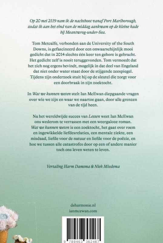 ALGEMEEN, Roman, Top 60Op 20 mei 2119 nam ik de nachtboot vanaf Port Marlborough, zodat ik aan het eind van de middag aankwam op de kleine kade bij Meantwrog-under-Sea. Tom Metcalfe, verbonden aan de University of the South Downs, is gefascineerd door een onwaarschijnlijk mooi gedicht dat in 2014 slechts één keer ten gehore is gebracht. Het gedicht zelf is nooit teruggevonden. Tom vermoedt dat het zich nog ergens bevindt, mogelijk in dat deel van Engeland dat niet onder water staat door de stijgende zeespiegel. Tijdens zijn onderzoek stuit hij op de sleutel die zorgt voor een doorbraak in zijn zoektocht. In Wat we kunnen weten stelt Ian McEwan diepgaande vragen over wie we zijn en waar we naartoe gaan, door alle grenzen van de tijd heen. Na het wereldwijde succes van Lessen weet Ian McEwan ons wederom te verrassen met een weergaloze roman. Wat we kunnen weten is een zoektocht, het gaat over roem en ingewikkelde liefdesrelaties, een mentale ziekte, een misdaad, liefde voor de natuur en liefde voor de poëzie, en hoe we tussen alle catastrofes door op een of andere manier toch ons leven weten te leven.